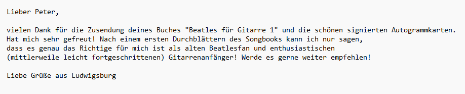 Feedback Zu meinen Gitarrenbüchern erhalte ich immer wieder Briefe, eMail oder andere Mitteilungen von Euch. Einige möchte ich Euch hier vorstellen. Ich freue mich über jedes Feedback von Euch… 1 2 3 ►